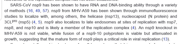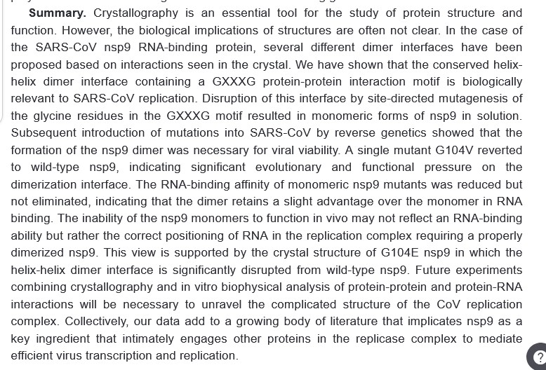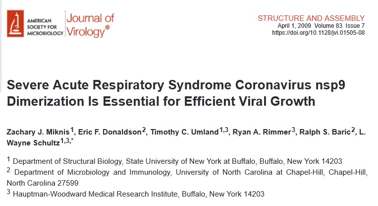 [7]: “Severe Acute Respiratory Syndrome Coronavirus nsp9 Dimerization Is Essential for Efficient Viral Growth.” Zachary J. Miknis, Eric F. Donaldson, Timothy C. Umland, Ryan A. Rimmer, Ralph S. Baric, L. Wayne Schultz. https://doi.org/10.1128/jvi.01505-08. 1 April 2009.