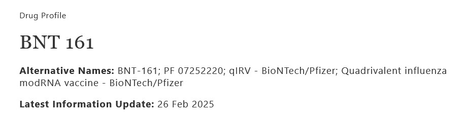 A screenshot from the Adisinsight Drug Profile for BNT161 is below. Note that this modRNA “vaccine” is a quadrivalent influenza injectable (https://adisinsight.springer.com/drugs/800052769):