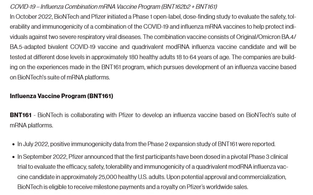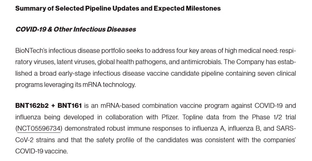 BNT161, one of the component modRNA “vaccines” in PF-07926307, is an influenza “vaccine”, meaning that it can be used against EITHER influenza OR COVID-19 (Omicron BA.4/BA.5.) The German partner of PfizerUSA — BioNTech — has been working on this injectable since at least 2022: https://biontechse.gcs-web.com/news-releases/press-release-details/biontech-announces-third-quarter-2022-financial-results-and, “BioNTech Announces Third Quarter 2022 Financial Results and Corporate Update”, 7 November 2022. A screenshot from this article is below: