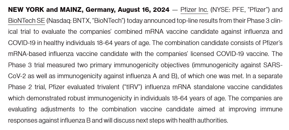The available-to-the-public information regarding PF-07926307 is both confusing and concerning. Pfizer-BioNTech insists that this “combo vaccine” is only for “prophylactic” use against COVID-19 plus influenza: https://investors.biontech.de/news-releases/news-release-details/pfizer-and-biontech-provide-update-mrna-based-combination, “Pfizer and BioNTech Provide Update on mRNA-based Combination Vaccine Program Against Influenza and COVID-19 in Individuals 18-64 Years of Age”, 16 August 2024. Only ONE of of the two outcomes measurements of the Phase 3 clinical trial for this “vaccine” were met (NCT06178991.) A screenshot from the company’s press release is below: