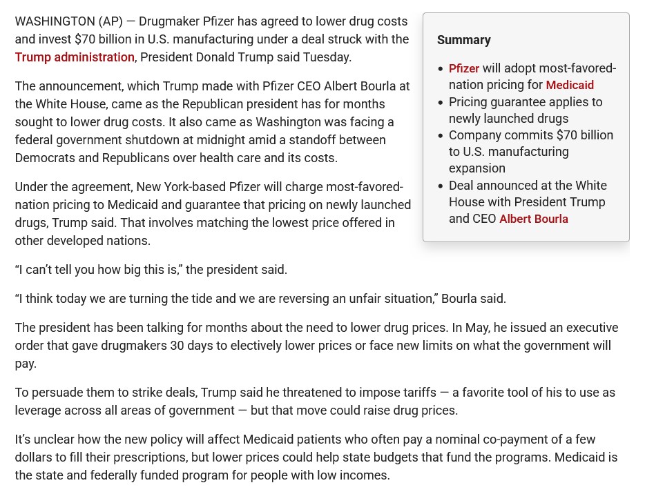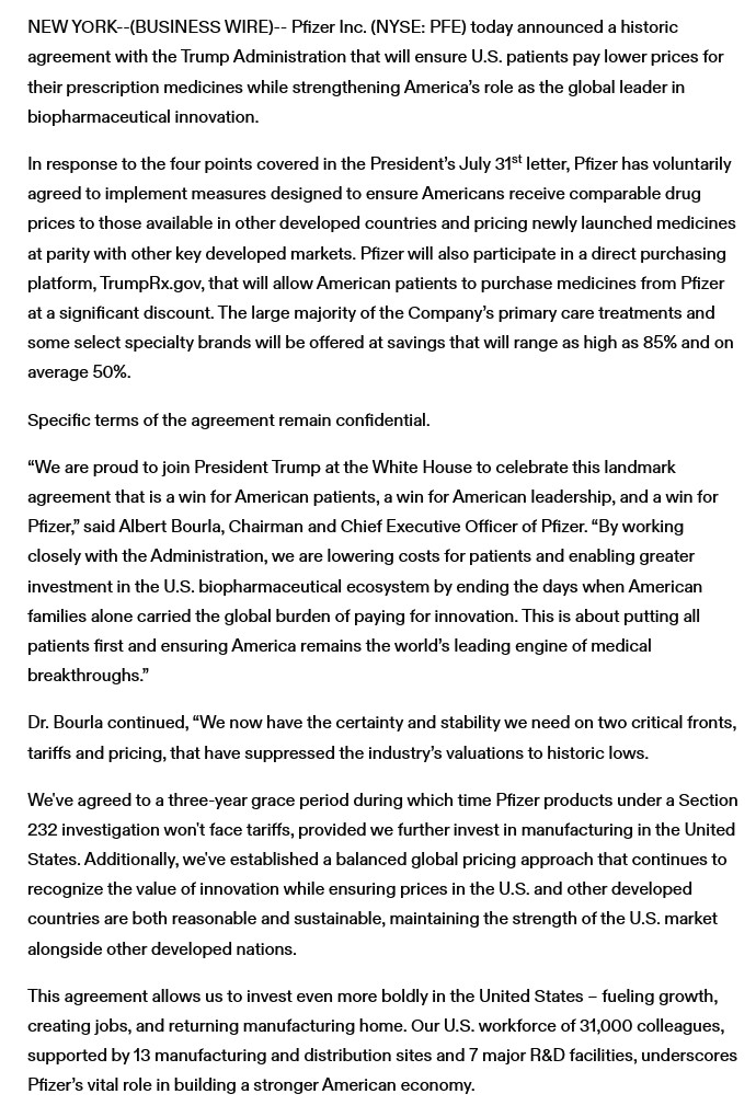 And, second, the announcement from PfizerUSA (https://www.pfizer.com/news/press-release/press-release-detail/pfizer-reaches-landmark-agreement-us-government-lower-drug, “Pfizer Reaches Landmark Agreement with U.S. Government to Lower Drug Costs for American Patients”, 30 September 2025. A screenshot from this article is below: