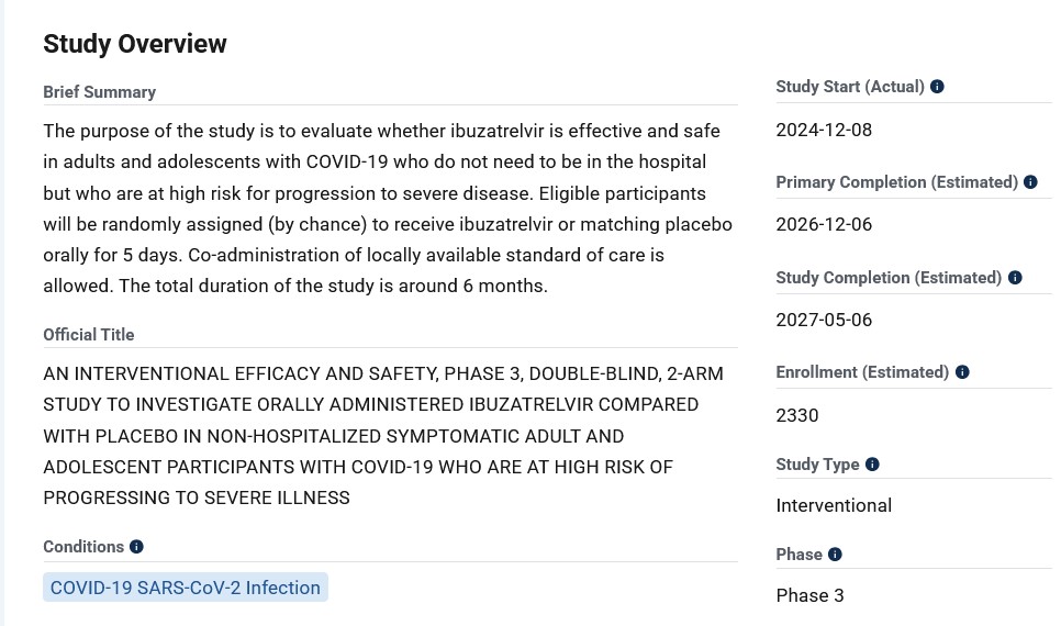 **** Ibuzatrelvir (PF-07817883), now in Phase 3 clinical trials, is an oral / enhanced “nirmatrelvir on steroids” treatment for COVID-19 infection that was granted “Fast Track” approval by the FDA The intended use of this drug appears to be as a “replacement” for Paxlovid.. Please see: https://pubs.acs.org/doi/10.1021/jacsau.4c00508, 30 July 2024. Pfizer has already patented this drug. Let’s take a look at the Overview of this Phase 3 clinical trial, as described here: https://clinicaltrials.gov/study/NCT06679140: