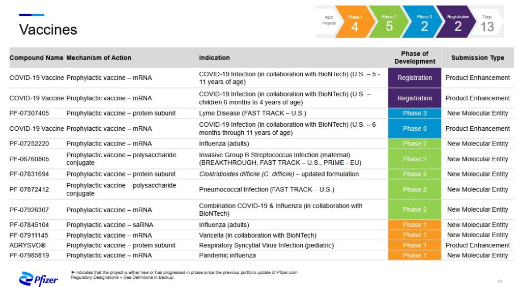 And now, the second screenshot from the “pipeline” PDF, Vaccines, is below. Yours Truly will discuss an interesting new “vaccine” from this list, under development by PfizerUSA (in conjunction with BioNTech) — PF-07926307, a combination modRNA-based COVID-19 plus influenza “vaccine“: