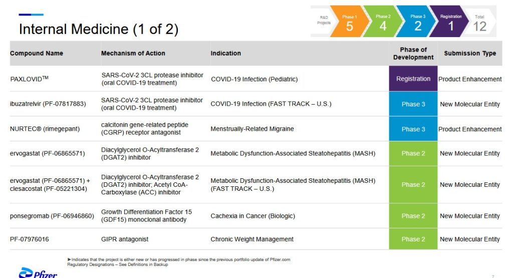 The most recent (as of 5 August 2025) PfizerUSA (and Pfizer-BioNTech) product “pipeline” website is here: https://www.pfizer.com/science/drug-product-pipeline. Click on “Downloadable PDF” to view the entire pipeline. Screenshots of two pipeline areas, Internal Medicine and Vaccines, follow. The first screenshot, Internal Medicine, with discussion by Yours Truly, is below: