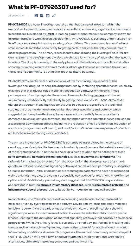 **** On the other hand, here is the article on PF-07926307 (BNT162b2 + BNT161) by the tech / AI / data collection and analysis platform, Patsnap: https://synapse.patsnap.com/article/what-is-pf-07926307-used-for?, 28 June 2024. A screenshot of the entire article is below; Yours Truly includes the entire article because it has a wealth of information and clues as to the possible real “agenda” behind this injectable: